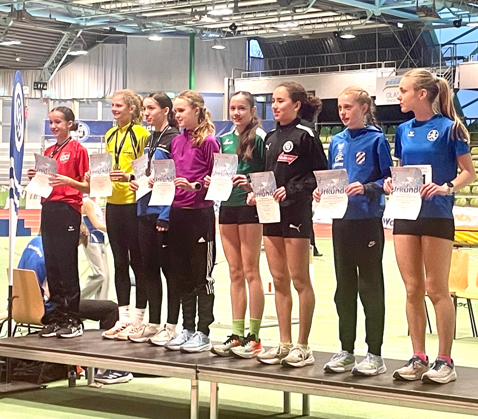 Mathilda Kovac (W14) und Martha Schäfer (W15)- vormittags noch in der Staffel im Einsatz- wagten ebenfalls einen Start über die 4 Hallenrunden. Während Martha (2:32,46 Minuten, Platz 6) nicht ganz zufrieden war, konnte Mathilda ein überzeugendes Rennen abliefern, was ihr eine neue persönliche Bestleistung 2:28,52 Minuten und Platz 5 in einem starken Teilnehmerfeld einbrachte.